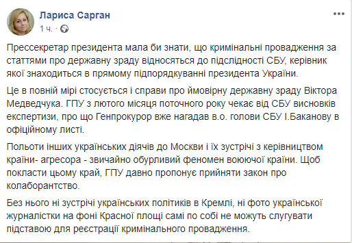 "Пресс-секретарь президента должна была знать, что уголовные производства по статьям о государственной измене относятся к подследственности СБУ, руководитель которого находится в прямом подчинении президента Украины. Это в полной мере касается и дела о возможной государственной измене Виктора Медведчука", - написала Сарган в понедельник.