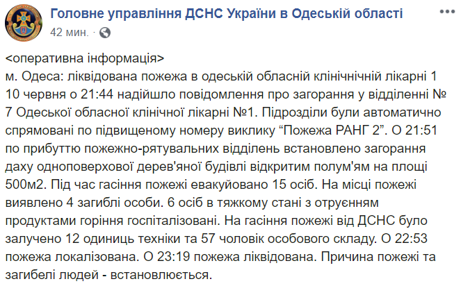 По официальному сообщению ГСЧС, во время тушения пожара эвакуировано 15 человек. На месте трагедии обнаружено четверо погибших. Как утверждают журналисты, это три пациента и медсестра.