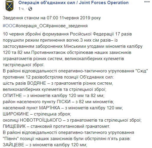 За минувшие сутки, 10 июня, противник 17 раз нарушил режим прекращения огня, потерь среди украинских военнослужащих нет. Об этом сообщает пресс-центр штаба операции Объединенных сил.