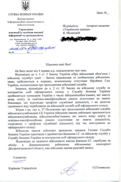 Председатель Службы безопасности Украины Василий Грицак лично присвоил воинское звание своему первому заместителю. "Воинское звание лейтенант присвоено приказом председателя Службы безопасности Украины одновременно с принятием Баканова И.Г. на военную службу в Службу безопасности Украины по контракту лиц офицерского состава", - говорится в ответе на журналистский запрос.