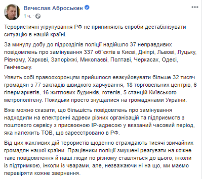"За прошедшие сутки в подразделения полиции поступило 37 ложных сообщений о заминировании 337 объектов в Киеве, Днепре, Львове, Луцке, Ровно, Харькове, Запорожье, Николаеве, Полтаве, Черкассах, Одессе, Геническе", - пишет Аброськин.