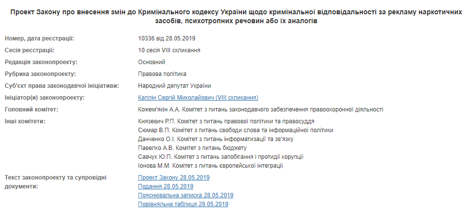 В конце прошлого месяца в Верховной Раде был зарегистрирован законопроект № 10336 "О внесении изменений в Уголовный кодекс Украины относительно уголовной ответственности за рекламу наркотических средств, психотропных веществ или их аналогов". Соответствующий документ зарегистрирован на сайте парламента.