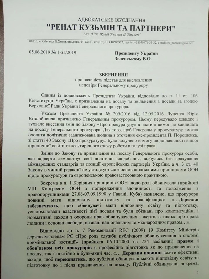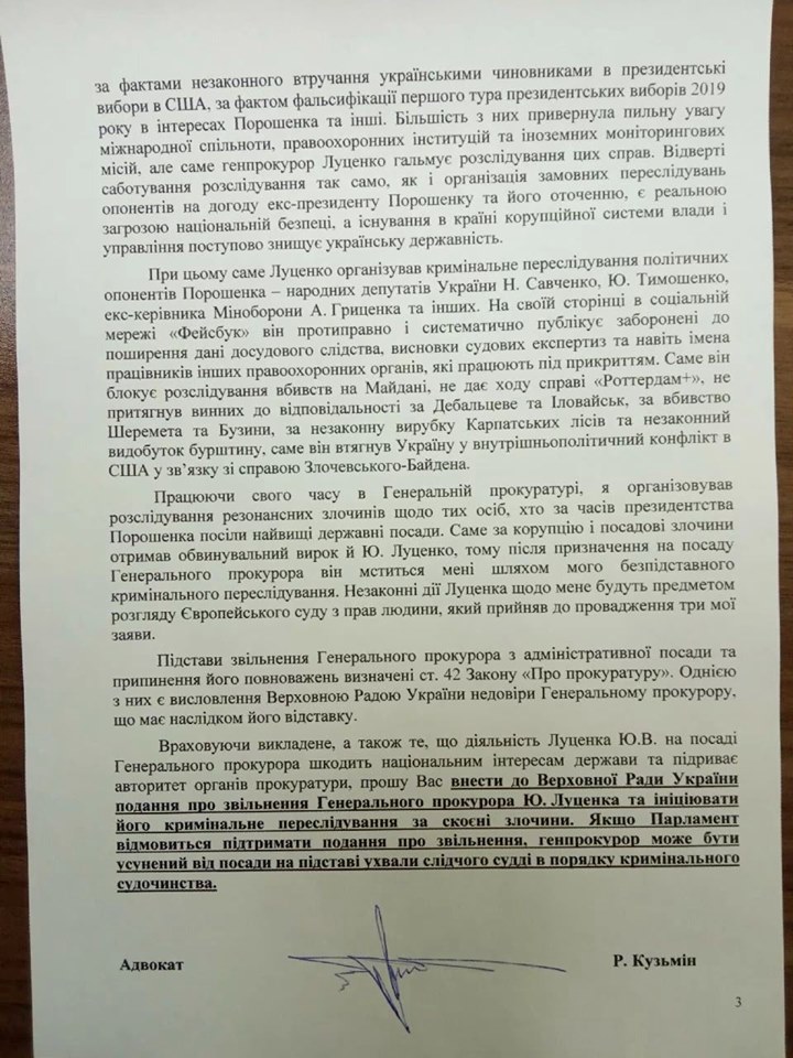 Он предлагает сравнить тексты своего обращения к президенту и обращения Зеленского к Раде. "Как видите, в Раду направлен коротенький, мягко говоря, документ без глубокого анализа украинского и международного законодательства, правоприменительной практики и доктрины, без ссылки на основания для увольнения генпрокурора, исчерпывающий перечень которых указан в законе и не подлежит расширенному толкованию", - подчеркивает Кузьмин.