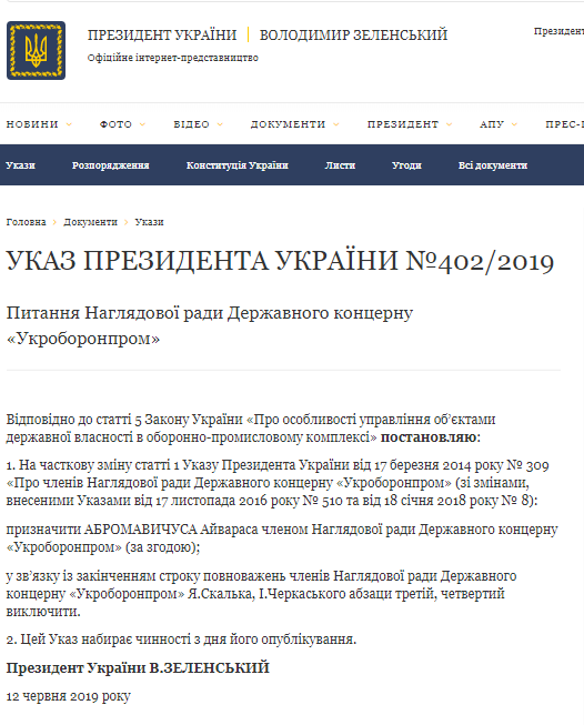 Согласно указу президента Украины №402/2019 от 12 июня 2019 года, Зеленский внес изменения в ст.1 президентского указа от 17 марта 2014 №309 "О членах наблюдательного совета Государственного концерна "Укроборонпром", дополнив его таким текстом: "назначить Абромавичуса Айвараса членом наблюдательного совета государственного концерна "Укроборонпром" (по соглашению)".