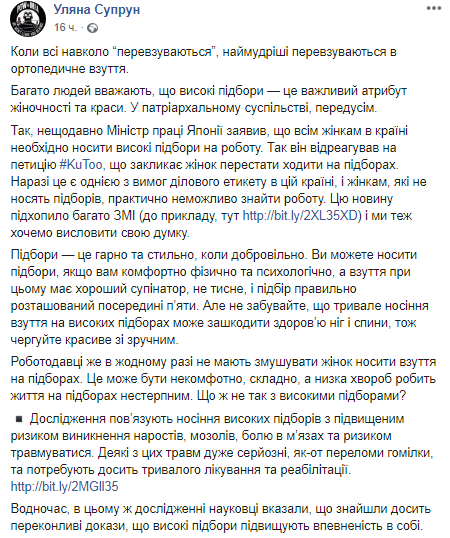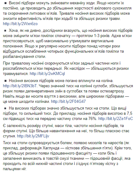 Длительное и постоянное ношение обуви на высоких каблуках может привести к травмам и плохо повлиять на колени. Об этом на своей странице в Facebook написала и.о. главы Минздрава Ульяна Супрун.