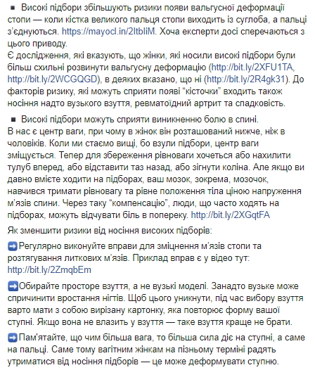 По словам Супрун, есть зависимость размера ступни, массы тела, частоты ношения каблуков и формы ступни: чем больше нагрузки на нее, тем более плоской становится ступня. Кроме того, высокие каблуки увеличивают риски появления вальгусной деформации стопы - когда кость большого пальца стопы выходит из сустава, а пальцы соединяются.