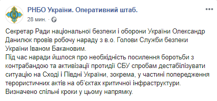 Секретарь Совета национальной безопасности и обороны Украины (СНБО) Александр Данилюк обсудил с и.о. главы Службы безопасности Украины Иваном Бакановым борьбу с контрабандой и противодействие терактам на объектах критической инфраструктуры на юго-востоке страны. Об этом сообщается на странице ведомства в соцсети.