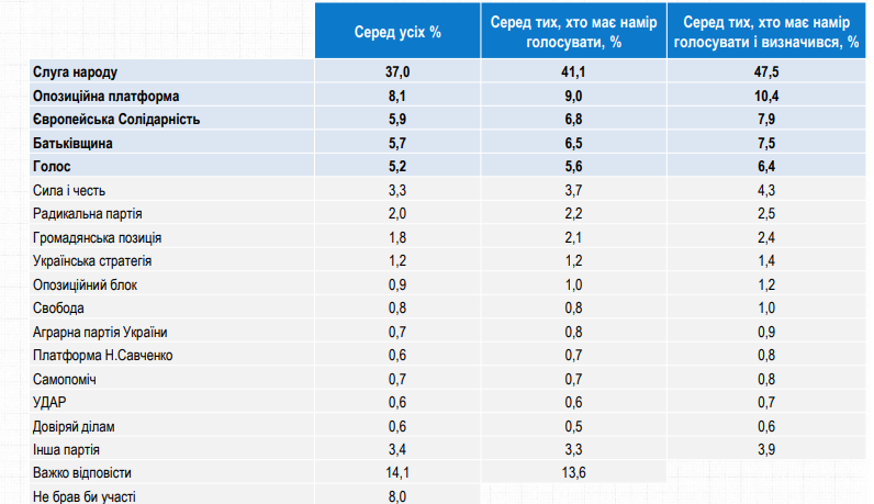 Партия "Слуга народа" остается лидером предвыборной гонки, ее готовы поддержать 47,5% тех, кто намерен голосовать и определился с симпатиями. Пятипроцентный проходной барьер также, по последним данным, преодолевают "Оппозиционная платформа - За жизнь" (10,4%), "Европейская Солидарность" (7,9%), "Батькивщина" (7,5%) и партия "Голос" (6 4%). Партию "Сила и честь" готовы поддержать 4,3%, Радикальную партию - 2,5%, партию "Гражданская позиция" - 2,4%, Рейтинг других политических сил - менее 2%.