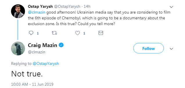 "Добрый день! Украинские СМИ пишут, что вы планируете снять 6-й эпизод "Чернобыля", который станет документальным фильмом о зоне отчуждения. Это правда? Не могли бы вы рассказать больше?" - спросил Остап.