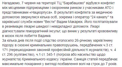 Напомним, 7 июня вечером на территории ТЦ "Барабашово" произошел конфликт с участием предпринимателей, ветеранов АТО и представителей "Нацкорпуса". В результате конфликта за медицинской помощью обратились 9 человек, в т.ч. Макарюк. Его госпитализировали в реанимацию больницы скорой и неотложной помощи. Врачи диагностировали геморрагический инсульт, произошедший в результате кровоизлияния в мозг после избиения.