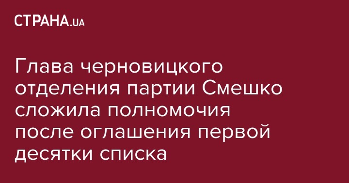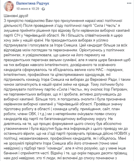 Глава черновицкого областного отделения партии Игоря Смешко "Сила и Честь" Валентина Радчук после оглашения первой десятки партийного списка решила сложить полномочия - из-за непрозрачности его формирования. Об этом она заявила на своей странице в Facebook.