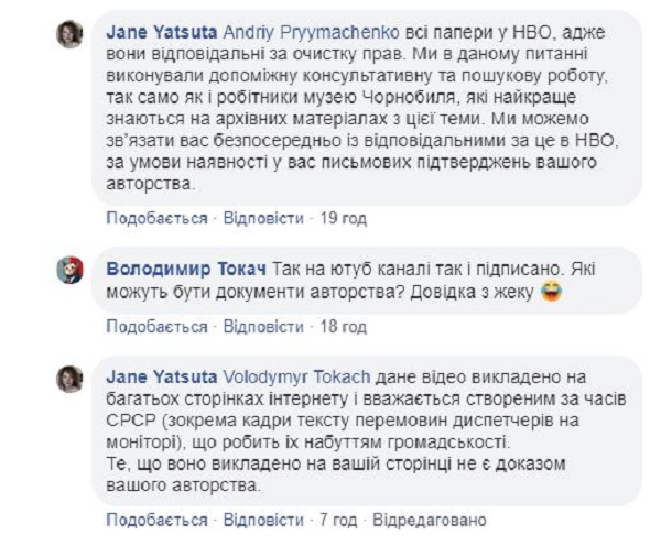 В Со Radioactive Films ответили Примаченко в Facebook: "Права на использование видео были получены и подтверждены дирекцией музея Чернобыля в Киеве". А Евгения Яцута предложила Андрею Примаченко связаться с организацией, если он предоставит письменное подтверждение своего авторства.