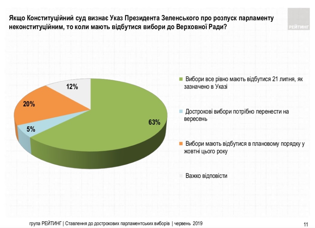 63% считают, что если Конституционный суд признает указ Зеленского о роспуске парламента неконституционным, то выборы в Верховную Раду все равно должны состояться 21 июля, как указано в решении главы государства. 20% утверждают, что в таком случае они должны пройти в плановом порядке в октябре с.г. Еще 7% за то, чтобы перевыборы состоялись в сентябре.