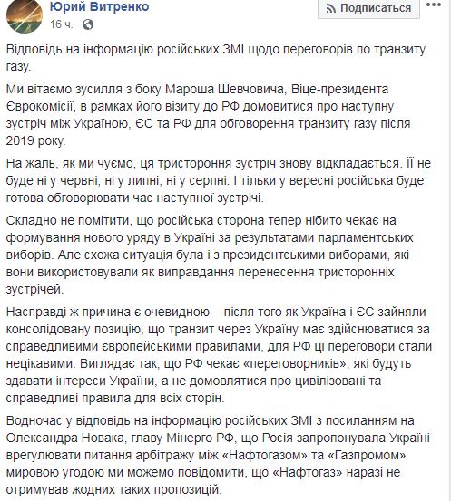 "После того как Украина и ЕС заняли консолидированную позицию, что транзит через Украину должен осуществляться по справедливым европейским правилам, для России эти переговоры (по газу - прим. ред.) стали неинтересными. Похоже, что РФ ждет "переговорщиков", которые будут сдавать интересы Украины, а не договариваться о цивилизованных и справедливых правилах для всех сторон", - написал Юрий Витренко.