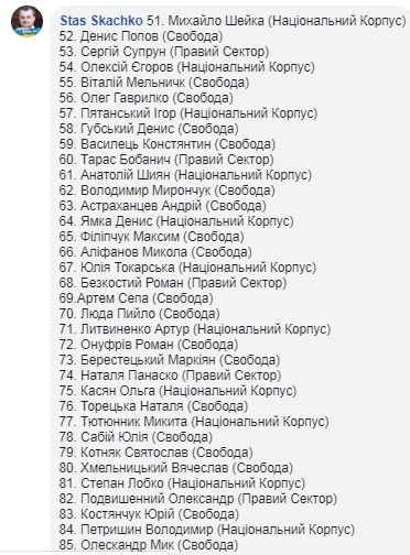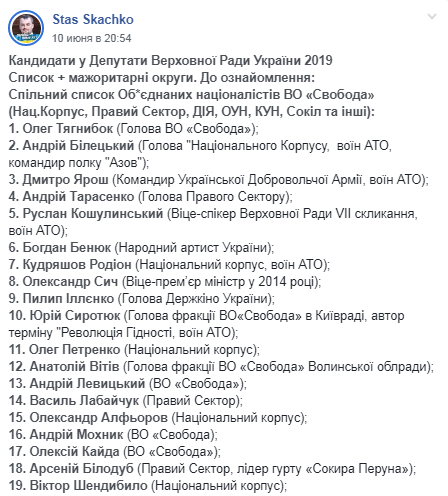 Опубликован список кандидатов в депутаты, с которым на выбором пойдет объединенный блок украинских националистов. Его обнародовал Станислав Скачко на странице "Объединенные украинские националисты" в Facbook.