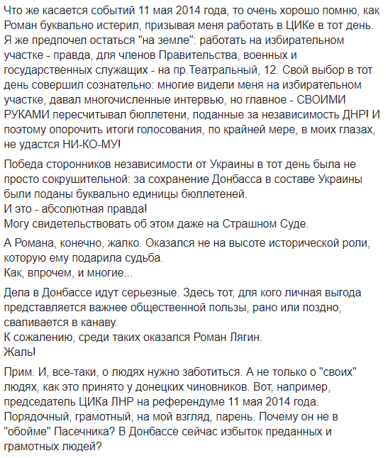 "Во время конфликта (по линии Ходаковский-Захарченко - ред.) Лягин грозился рассказать прессе какие-то непорядочные, на его взгляд, подробности выборного процесса в "ДНР", и это было расценено властями "ДНР" как попытка нанесение ущерба республике в условиях военного времени", - писал сторонник сепаратистов, волонтер Александр Жучковский. Кроме этого, по его словам, Лягин "перешел на личности", нанеся Захарченко серьезные обиды.