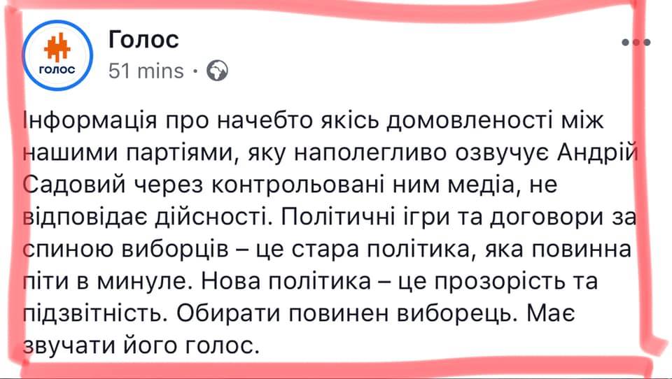 Мэр Львова Андрей Садовой, который возглавил партию "Самопомощь" на выборах в Раду, заявил, что он согласует с лидером партии "Голос" Святославом Вакарчуком общих кандидатов на округах, однако в "Голосе" эту информацию опровергли.