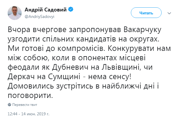 "Вчера в очередной раз предложил Вакарчуку согласовать общих кандидатов на округах. Мы готовы к компромиссам. Конкурировать нам между собой, когда в оппонентах местные феодалы как Дубневич на Львовщине, или Деркач на Сумщине - нет смысла", - написал в Twitter Садовой.