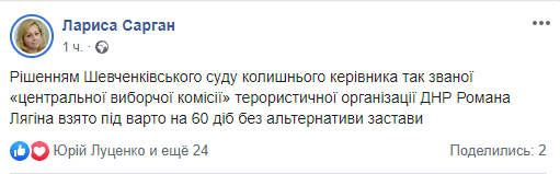 "Решением Шевченковского суда бывший руководитель так называемой "центральной избирательной комиссии" террористической организации "ДНР" Роман Лягин взят под стражу на 60 суток без альтернативы залога", - написала Сарган на своей странице в соцсети Фейсбук в пятницу.