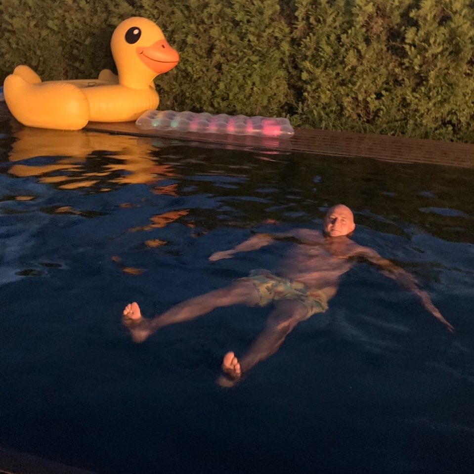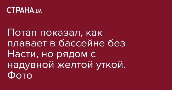 Потап показал, как плавает в бассейне без Насти, но рядом с надувной желтой уткой. Фото