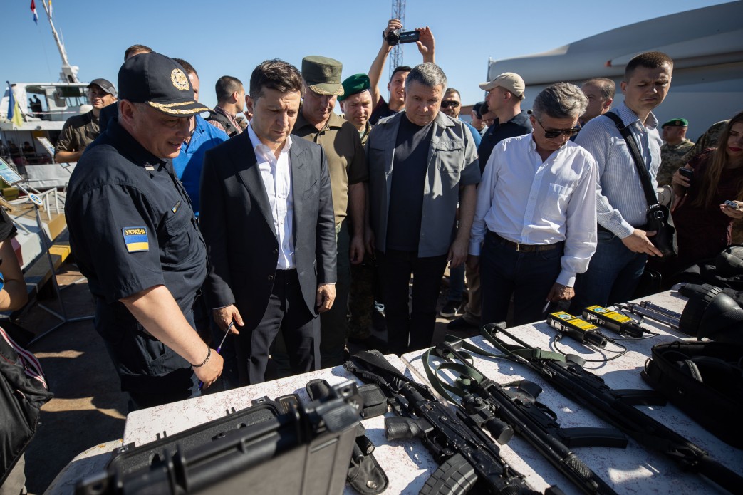"На палубе судна "Капитан Чусов" глава государства посмотрел показательные занятия морских подразделений Государственной службы Украины по чрезвычайным ситуациям, Государственной пограничной службы, Национальной гвардии, саперов, водолазов подводного разминирования. Подразделения отработали обучение по задержанию судна-нарушителя с применением вертолета Нацгвардии, кораблей морской охраны", - говорится в сообщении.
