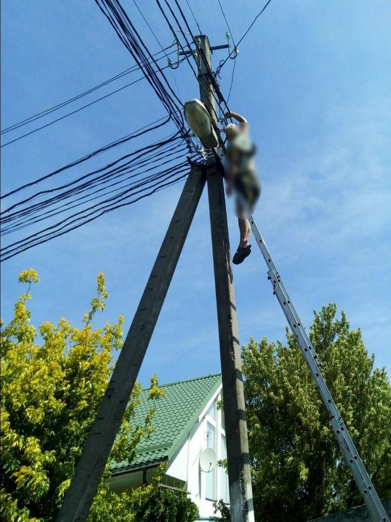 Под Днепром выполнявший ремонтные работы электрик погиб от удара током и повис на электроопоре. Фото 18+