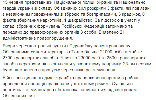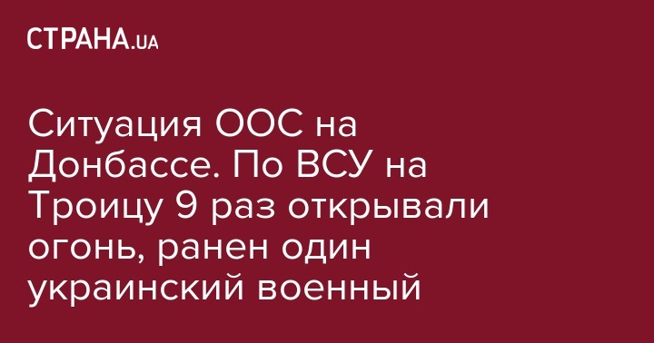 В воскресенье, 16 июня, незаконные вооруженные формирования с начала суток осуществили девять обстрелов позиций в зоне операции объединенных сил (ООС), один украинский военнослужащий получил ранения. Об этом говорится в сводке ООС на странице в Facebook.