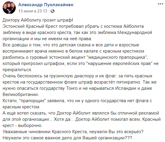 Эстонское отделение Красного Креста поставило условие таллинскому Русскому молодежному театру убрать эмблему организации с костюма главного героя спектакля "Доктор Айболит". В противном случае театру грозит штраф. Об этой несколько абсурдной ситуации рассказал директор и худрук театра Александр Пуолакайненна своей странице в Facebook.