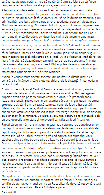 "Послание, которое я хочу донести до граждан, заключается в том, что я нахожусь на баррикадах, я вернусь в страну как можно скорее, как только моя семья будет в безопасности, и я буду в безопасности, я буду работать для того, чтобы Молдова стала стабильной страной, а люди жили в мире и покое", - заявил лидер ДПМ.