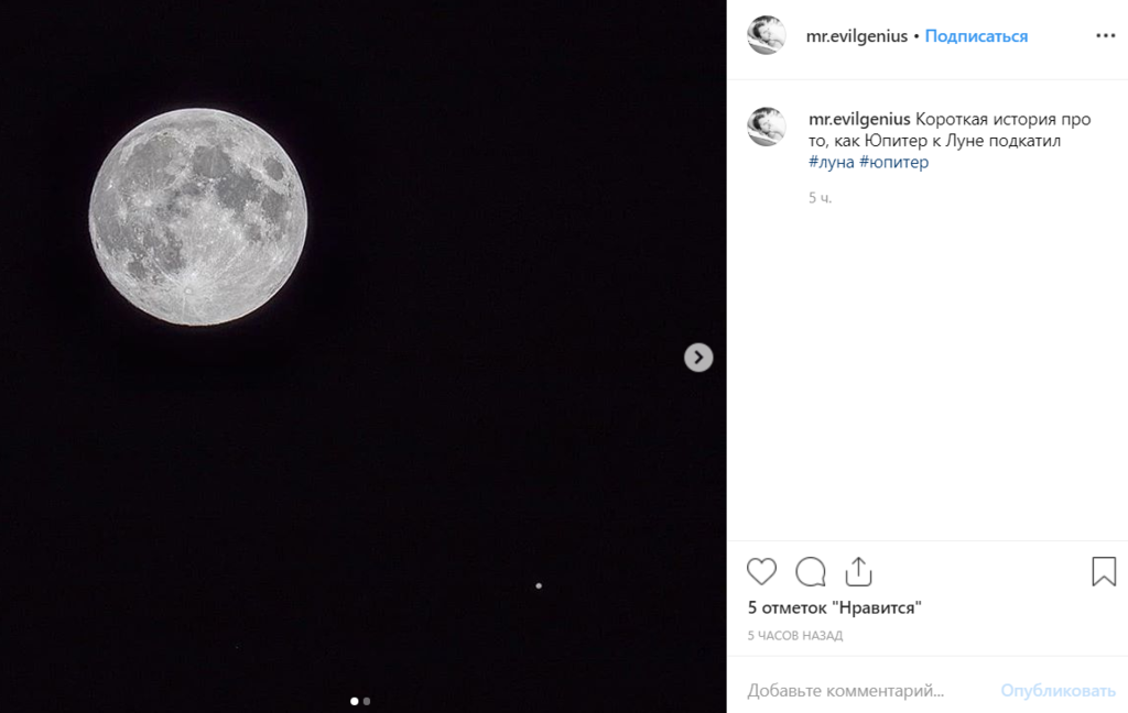 Юпитер приблизился на расстояние примерно 640 млн км к Земле и стал третьим самым ярким объектом в ночном небе нашей планеты после Луны и Венеры.