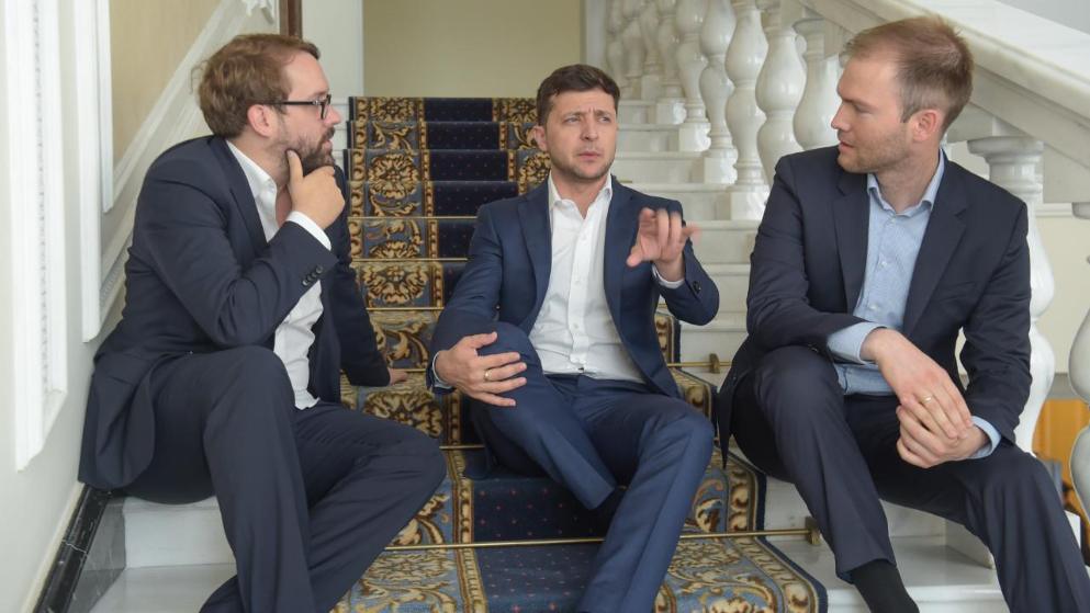 Репортеры Bild Пол Ронхаймер (слева) и Джулиан Ропке беседуют с Зеленским, фото: bild.de