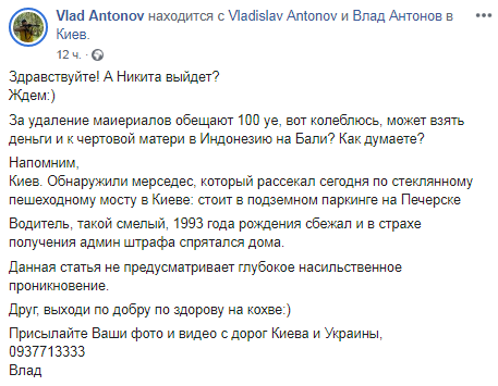 После того как в Киеве обнаружили автомобиль Mercedes, который 17 июня заехал на новый стеклянный пешеходный мост, а фото машины выложил паблик dtp.kiev.ua Влад Антонов в социальных сетях, ему поступило предложение удалить посты за 100 долларов. Об этом сообщил сам Антонов в Facebook.