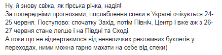 "Ну, и опять свежая, как горная река, надежда! По предварительным прогнозам, ослабление жары в Украине ожидается 24-25 июня. Постепенно: сначала запад затем север, центр и уже с 26-27 июня станет легче и на юге и востоке. А пока не отворачиваемся от небольших рекламных буклетов в переходах, ими можно хорошо махать на себя от жары", - написала Наталья Диденко.