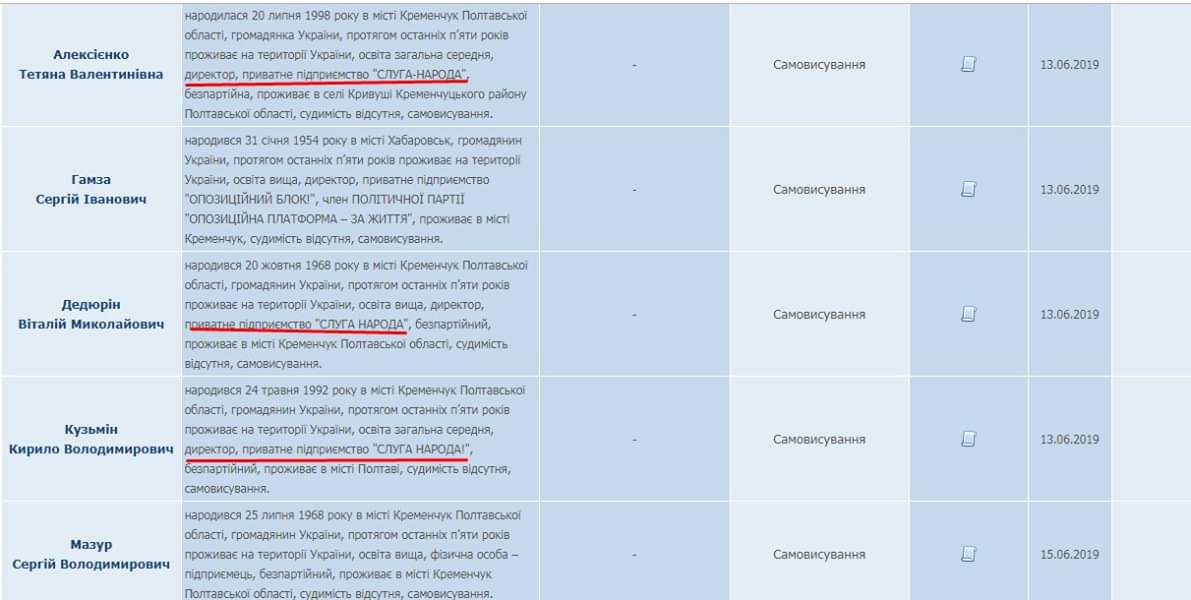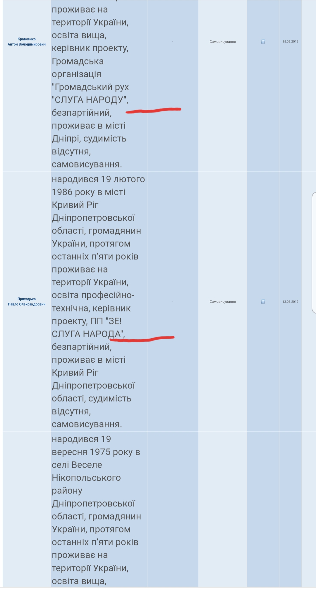 Все потенциальные депутаты в краткой биографической справке указали принадлежность к общественной организации или работу на предприятии с названием "Слуга народа".