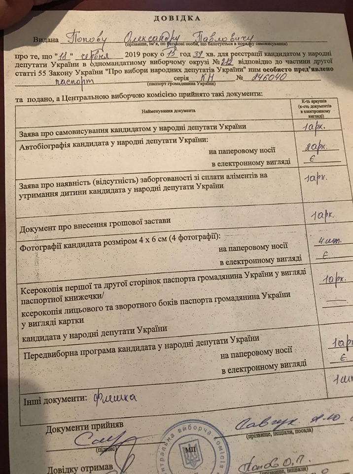 Сегодня, 18 июня, бывший председатель Киевской городской государственной администрации Александр Попов (2010-2014) подал документы в ЦИК. Он будет баллотироваться в Верховную Раду по мажоритарной системе как самовыдвиженец на 212 округе. Об этом он написал на своей странице в Facebook.