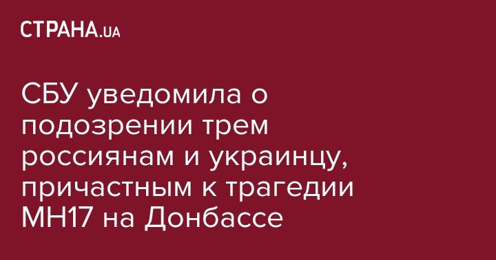 Служба безопасности Украины уведомила о подозрении трех граждан России - Игоря Гиркина (Стрелкова), Сергея Дубинского, Олега Пулатова и украинца Леонида Харченко в организации и пособничестве террористического акта, который привел к крушению "Боинга 777" Малазийский авиалиний (рейса MH17) в небе над Донбассом в 2014 году. Об этом сообщает пресс-служба СБУ.