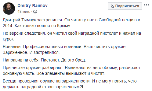 "Дмитрий Тымчук застрелился. Он читал у нас в Свободной лекцию в 2014. Как только пошло по Крыму. По версии следствия, он чистил свой наградной пистолет и нажал на курок. Военный. Профессиональный военный. Взял чистить оружие. Заряженное. И застрелился. Направив на себя. Пистолет. Да это бред.