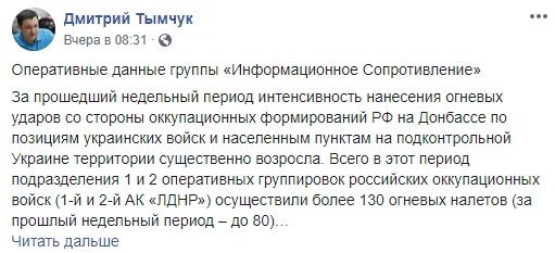 Накануне своей гибели нардеп публиковал сводку "Информационного сопротивления" о ситуации на Донбассе. По его данным, количество обстрелов существенно возросло.