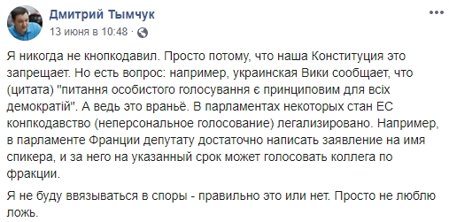 Также 13 числа депутат написал: "Я никогда не кнопкодавил. Просто потому, что наша Конституция это запрещает. Но есть вопрос: например, украинская Вики сообщает, что (цитата) "питання особистого голосування є принциповим для всіх демократій". А ведь это враньё. В парламентах некоторых стан ЕС конпкодавство (неперсональное голосование) легализировано. Например, в парламенте Франции депутату достаточно написать заявление на имя спикера, и за него на указанный срок может голосовать коллега по фракции. Я не буду ввязываться в споры - правильно это или нет. Просто не люблю ложь".
