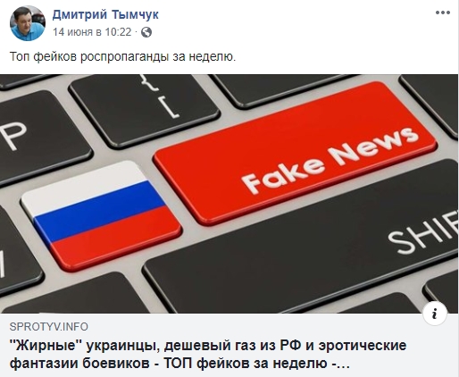 14 числа нардеп поделился статьей "Информационного сопротивления" о фейках в российских СМИ про Украину.