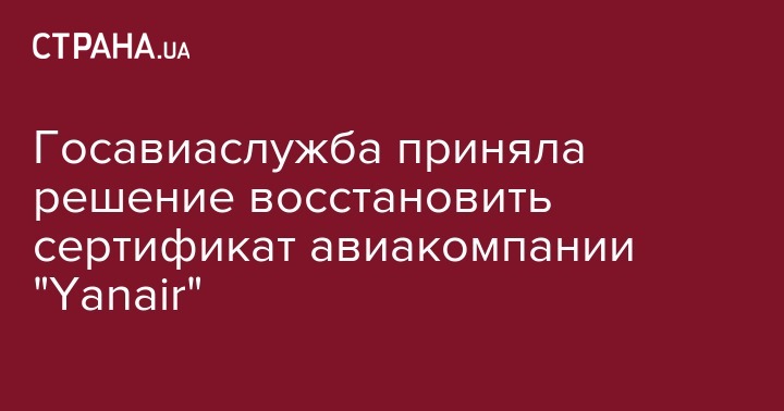 Госавиаслужба приняла решение восстановить сертификат авиакомпании "Yanair". Об этом заявил министр инфраструктуры Владимир Омелян на своей странице в Facebook.