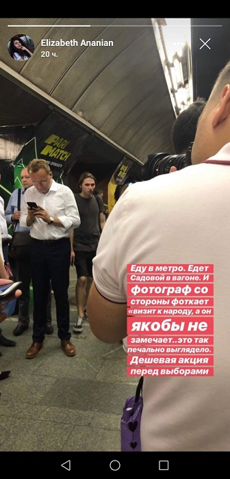 Об этом пишут пользователи социальных сетей. "Еду в метро. Едет Садовой в вагоне. И фотограф со стороны фоткает "визит к народу", а он якобы не замечает. Это так печально выглядело. Дешевая акция перед выборами", - сообщает пользователь Elizabeth Ananian в своей истории на Facebbook.