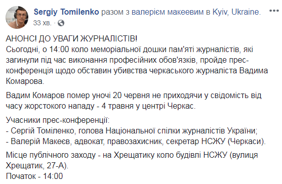 "Сегодня, в 14:00 возле мемориальной доски памяти журналистов, погибших при исполнении профессиональных обязанностей, пройдет пресс-конференция по обстоятельствам убийства черкасского журналиста Вадима Комарова.