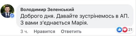 "Здравствуйте. Давайте встретимся в АП. С вами свяжется Мария", - говорится в комментарии под публикацией Гандзюка в Фейсбуке.
