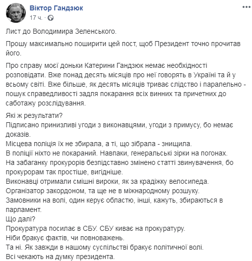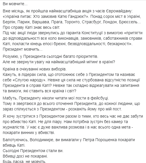 "Я хочу встретиться с президентом вместе с теми, кто все время не дает забыть об убийстве Кати. Не для пиара. Нам нужна встреча без камер и журналистов. У нас есть очень важный разговор и у нас всего одна цель - наказать виновных в убийстве", - говорилось в открытом письме Виктора Гадзюка, опубликованном на его фб-странице.