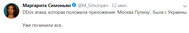 В своем Twitter главный редактор телеканала RT Маргарита Симоньян заявила, что DDos-атака была совершена из Украины. Из-за действий злоумышленников перестало работать приложение "Москва Путину". Однако его уже восстановили.