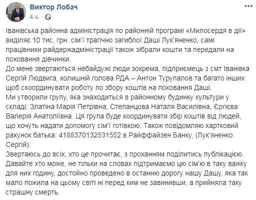 Также он сообщил карточный счет отца погибшей Даши - Сергея Лукьяненко: 4188 3701 3253 1552 Райффайзен Банк.