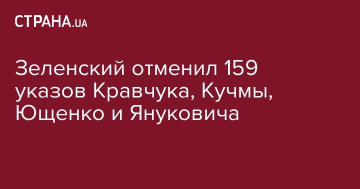 Президент Украины Владимир Зеленский подписал два указа о признании утратившими силу 159 указов, изданных первыми тремя президентами Леонидом Кравчуком, Леонидом Кучмой, Виктором Ющенко и экс-президентом Украины Виктором Януковичем. Соответствующие указы №418/2019 и №419/2019 были подписаны в четверг, 20 июня.