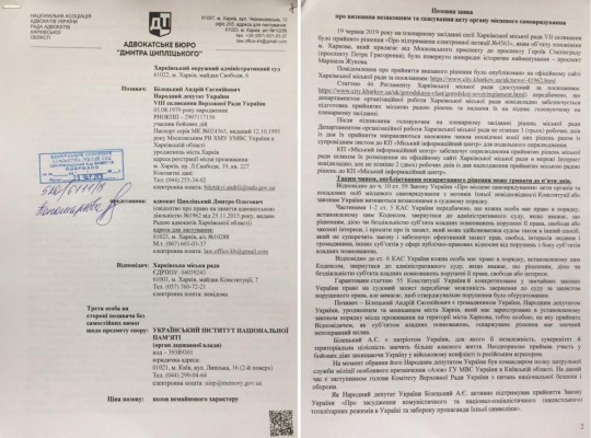 "В своем иске народный депутат требует признать незаконным соответствующее постановление Харьковского городского совета и отменить акт органа местного самоуправления", - сообщает пресс-служба "Нацкорпуса" в четверг.