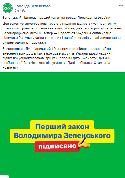 "Зеленский подписал первый закон в должности Президента Украины! Этот закон устанавливает новые правила предоставления отпусков усыновителям детей-сирот: раньше оплачиваемый отпуск предоставлялся в случае усыновления новорожденного ребенка, теперь - предоставляется 56-дневный оплачиваемый отпуск без учета праздничных и нерабочих дней в случае усыновления ребенка одним из супругов", - говорится в сообщении.